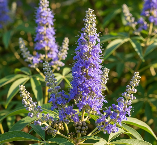 Vitex agnus-castus, commonly known as chaste tree, monk’s pepper, or chasteberry, is a deciduous shrub or small tree native to the Mediterranean region and western Asia. It is valued both as an ornamental plant and for its traditional medicinal uses. The plant can grow between 9 to 18 feet tall, developing a multi-stemmed form with an open, spreading habit. Its aromatic, palmate leaves resemble those of cannabis in shape, though they are typically gray-green in color. During summer, it produces long, showy spikes of small lavender to violet flowers that are highly attractive to bees, butterflies, and other pollinators. These flowers give way to small, peppercorn-like berries that have a spicy, pungent aroma.